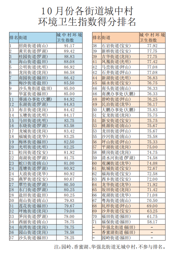 10月份各街道城中村環(huán)境衛(wèi)生指數(shù)得分排名