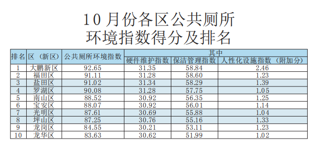 龍華、龍崗兩區(qū)已多次在公廁環(huán)境指數(shù)測評中排名墊底,應(yīng)當(dāng)引起重視,學(xué)習(xí)先進(jìn),加強(qiáng)“廁所革命”力度進(jìn)度,全面消除轄區(qū)公廁短板。