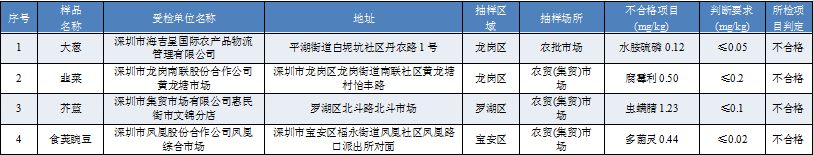 見圳客戶端·深圳新聞網2019年11月12日訊 11月11日,深圳市市場監(jiān)督管理局發(fā)布9月16日-9月20日深圳市農產品質量安全豬肉和蔬菜例行監(jiān)測結果。2019年9月16日-9月20日,深圳市市場監(jiān)督管理局在全市監(jiān)測豬肉產品53份,抽檢結果顯示全部樣品合格。抽檢蔬菜共124份,4份抽樣樣品不合格,都為農藥檢測超標。其中,深圳市海吉星國際農產品物流管理有限公司銷售的大蔥水胺硫磷超標,深圳市龍崗南聯股份合作公司黃龍?zhí)潦袌鲣N售的韭菜腐霉利超標,深圳市集貿市場有限公司惠民街市文錦分店銷售的芥藍蟲螨腈超標,深圳市鳳凰股份合作公司鳳凰綜合市場銷售的食莢豌豆多菌靈超標。
