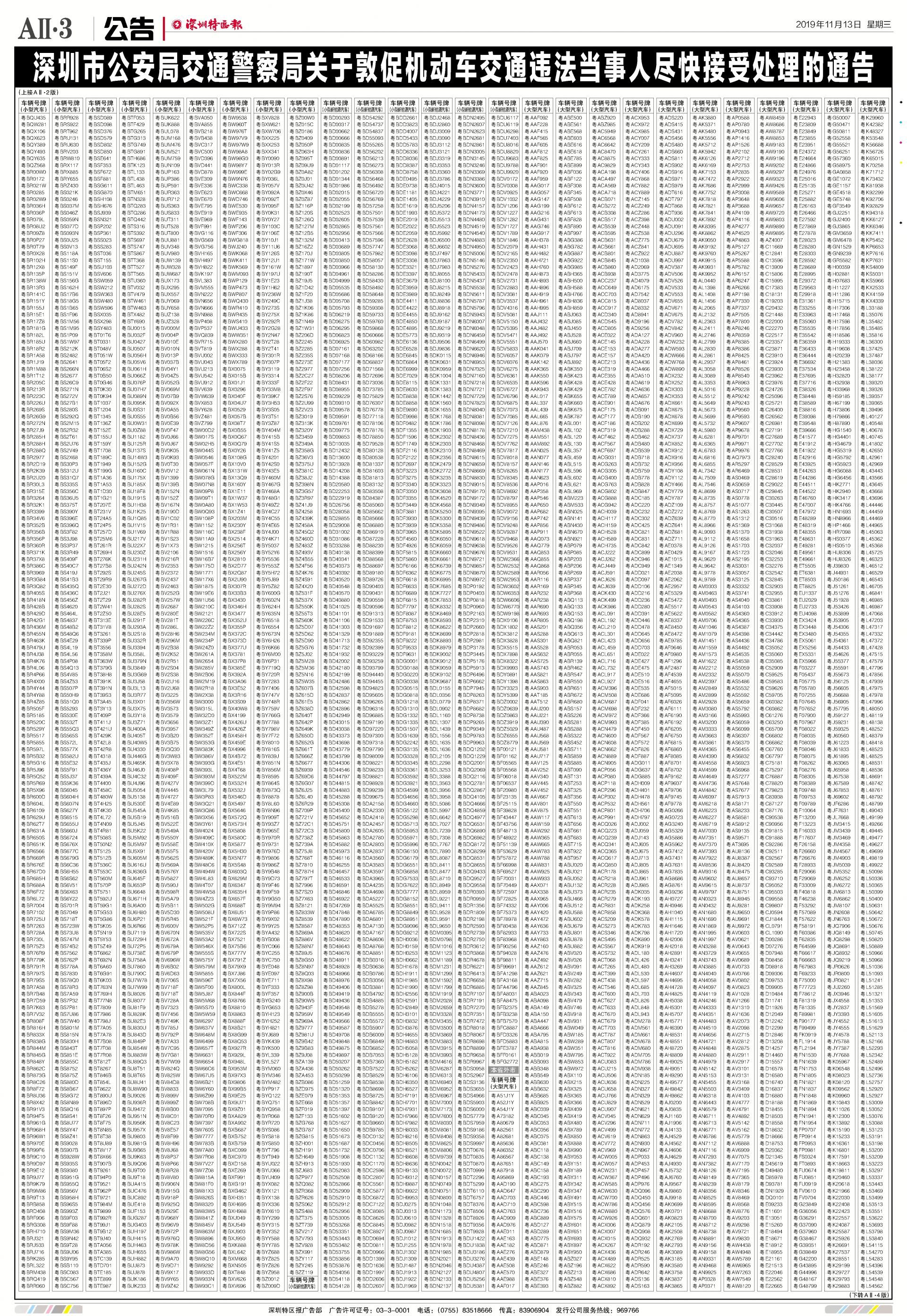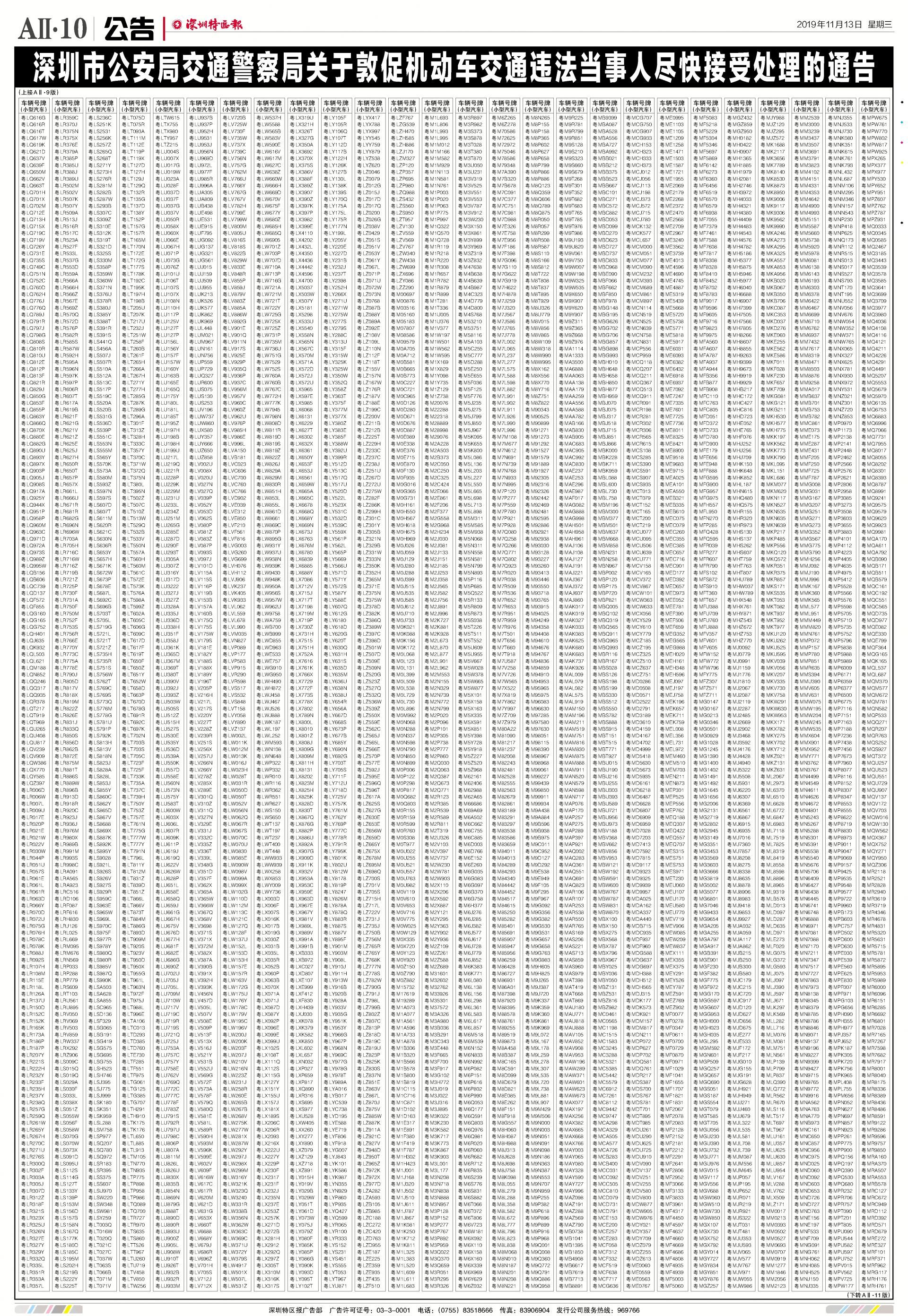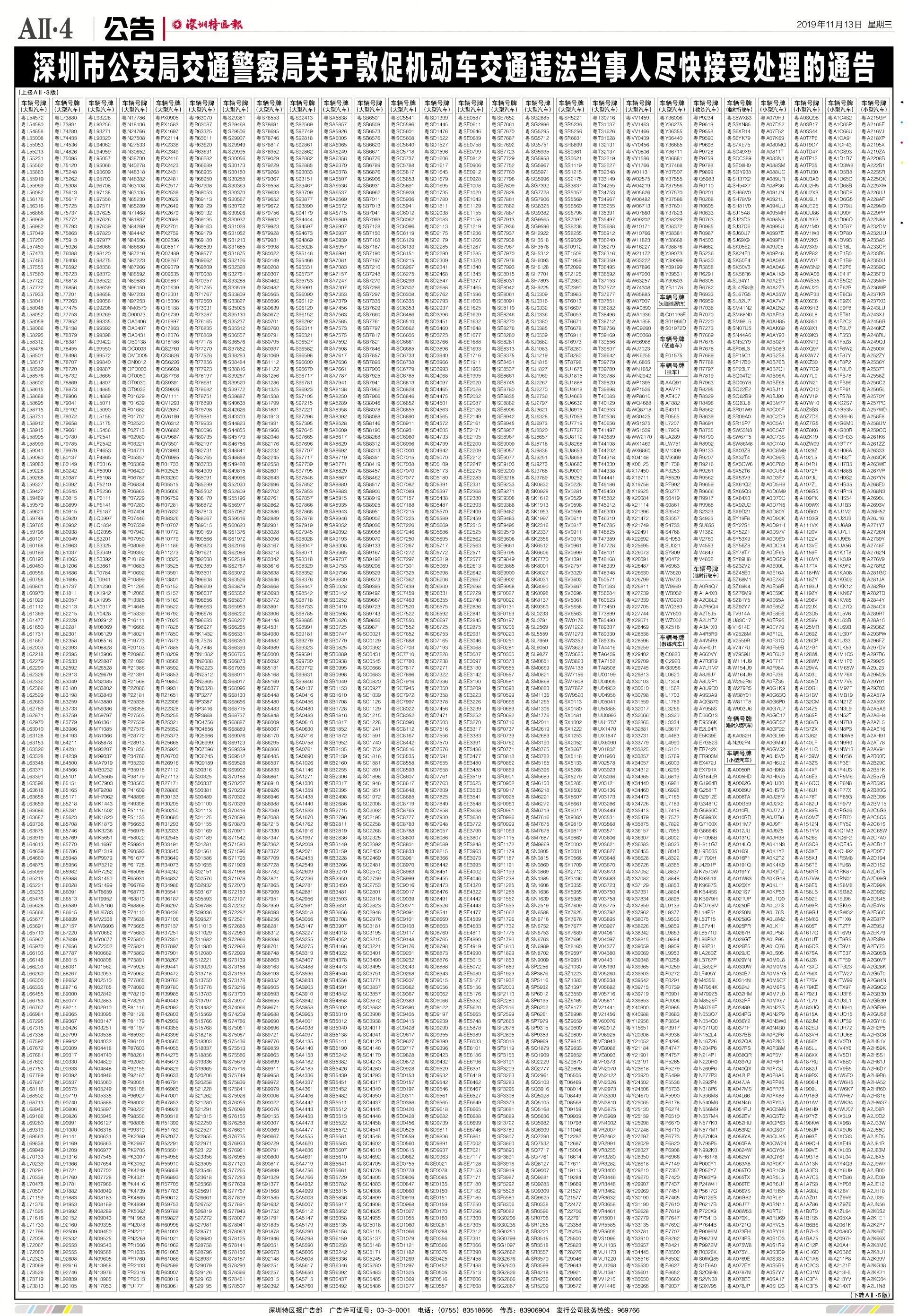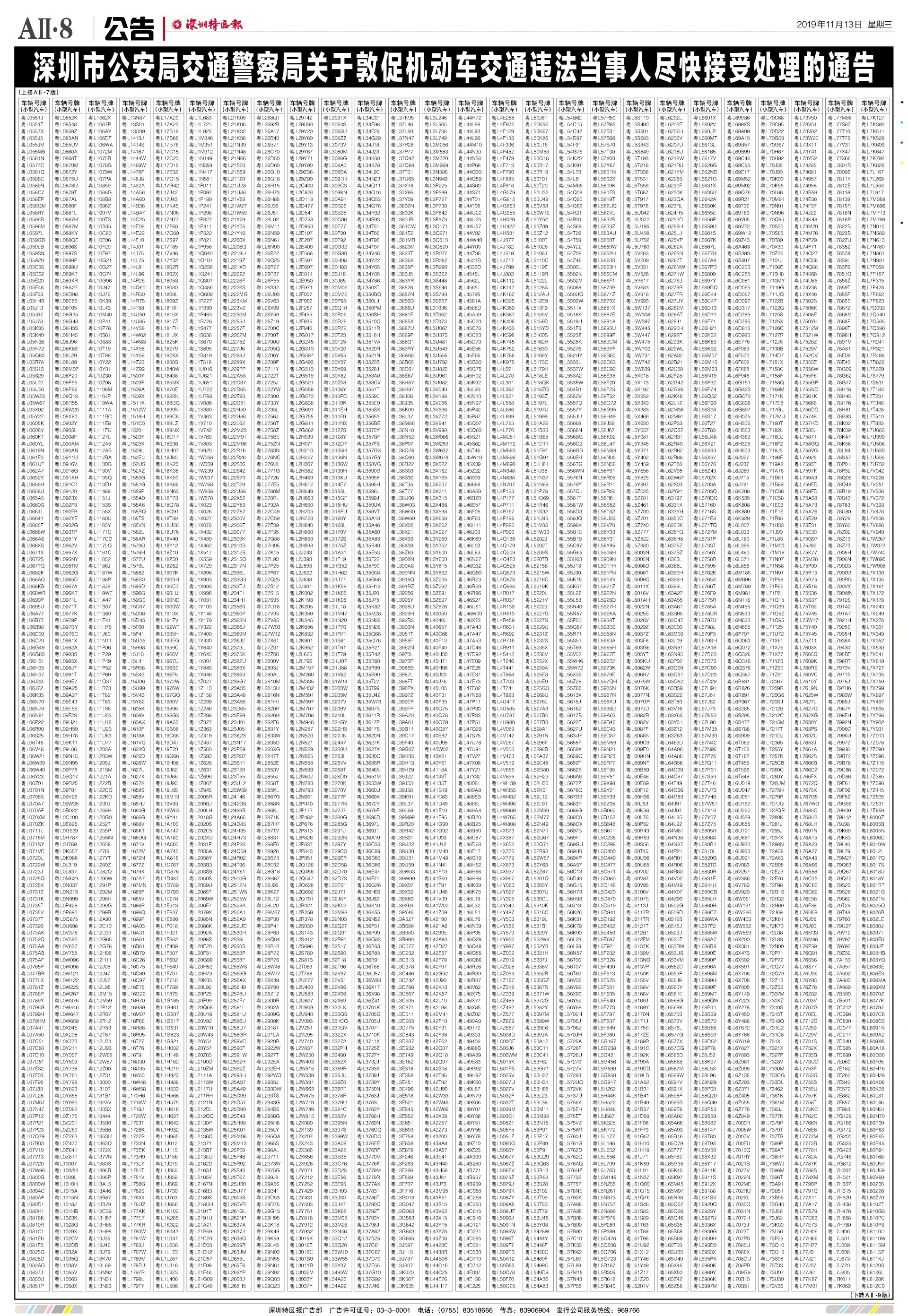 今年7月至10月初,全市機動車被“電子警察”抓拍交通違法行為1342781宗,深圳交警通過多種方式進行交通違法行為告知,但截止至目前仍有部分機動車的非現場交通違法未及時處理。