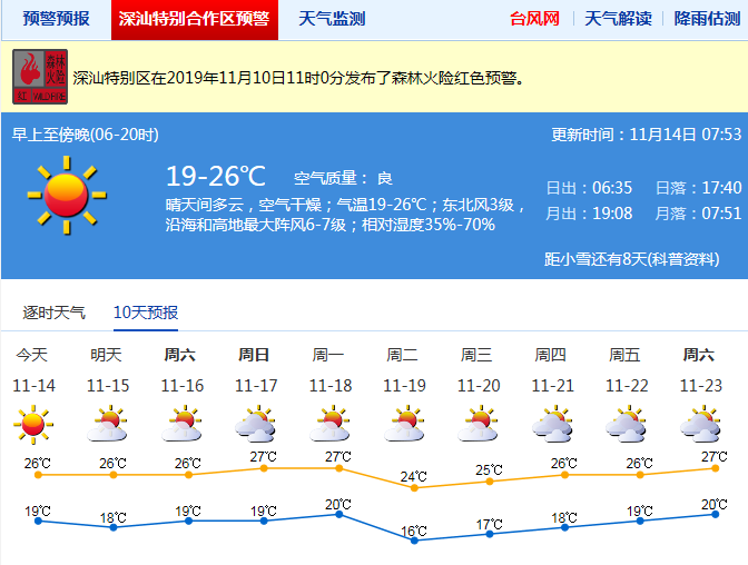 深圳市氣象臺(tái)預(yù)計(jì),13日夜間至14日受冷空氣影響,我市沿海、高地和海區(qū)最大陣風(fēng)7級(jí)左右,氣溫略降,19-26℃;15-17日晴天,風(fēng)力減弱;18-19日受新一股冷空氣影響,北風(fēng)再次加大,氣溫下降。