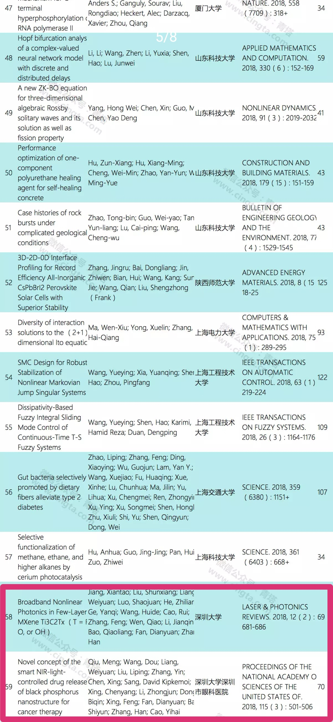 張晗教授課題組入選的2篇論文分別為《Broadband Nonlinear Photonics in Few-Layer MXene Ti3C2Tx (T = F, O, or OH)(新型智能近紅外光控黑磷納米結(jié)構(gòu)釋藥系統(tǒng)用于癌癥治療)》,所屬機(jī)構(gòu)為深圳大學(xué),來源期刊為《LASER & PHOTONICS REVIEWS.2018,12(2):681-686(美國科學(xué)院院刊)》,被引次數(shù)69;《Novel concept of the smart NIR-light-controlled drug release of black phosphorus nanostructure for cancer therapy(少層MXene納米片中的非線性光子學(xué))》,所屬機(jī)構(gòu)為深圳大學(xué)深圳市眼科醫(yī)院,來源期刊為《PROCEEDINGS OF THE NATIONAL ACADEMY OF SCIENCES OF THE UNITED STATES OF.2018,115(3):501-506(激光光子學(xué)評論)》,被引次數(shù)70。