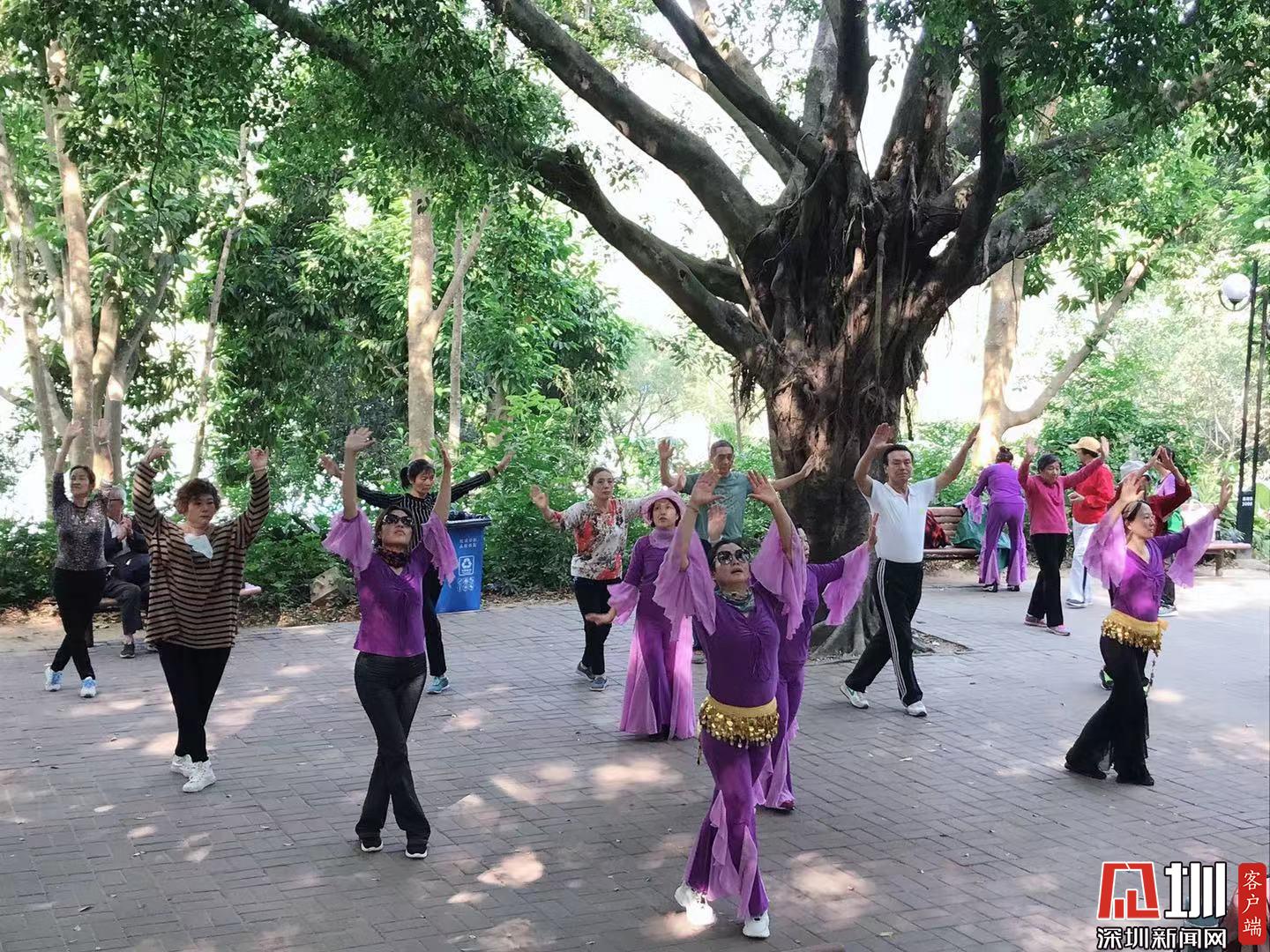 市民在蓮花山集體晨練,秩序井然,文明運(yùn)動(dòng)。