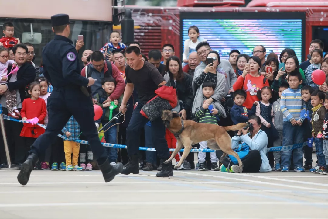 演出科目:跳躍人體障礙、實(shí)戰(zhàn)撲咬、箱包搜索、解救人質(zhì)、跳火圈等
