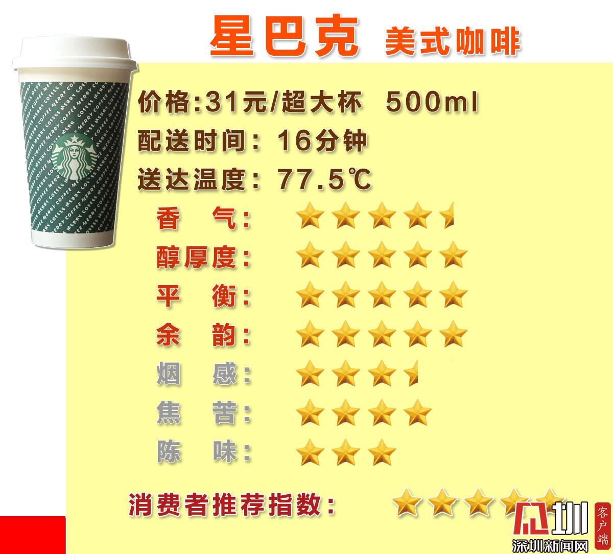 綜合“美式(熱)”咖啡主觀評(píng)測(cè)的4個(gè)正值評(píng)分(香氣、醇厚感、平衡度、余韻)以及3個(gè)負(fù)值評(píng)分(煙感、焦苦、陳味),最終星巴克在消費(fèi)者推薦指數(shù)評(píng)分中脫穎而出收獲5星好評(píng),瑞幸咖啡與太平洋咖啡分別獲得4星好評(píng),出乎意料的是Costa咖啡僅獲得3星評(píng)價(jià),在參與測(cè)評(píng)的20位消費(fèi)者中口碑較差。