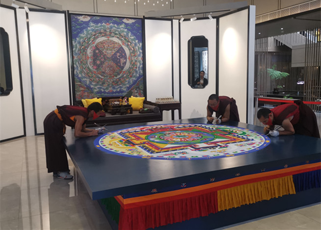 在活動現(xiàn)場,壇城沙畫的現(xiàn)場制作格外引人注目?!耙簧骋皇澜纾蝗~一菩提”——壇城沙畫的過程仿佛一場視覺的盛宴。據(jù)了解,壇城是指對一座宮殿一個(gè)世界的泛義,用珍貴珊瑚、瑪瑙、綠松石等礦物質(zhì)研磨成粉,落沙即成畫,畫面立體生動,壇城展示了高度的藝術(shù)魅力和視覺觀感。