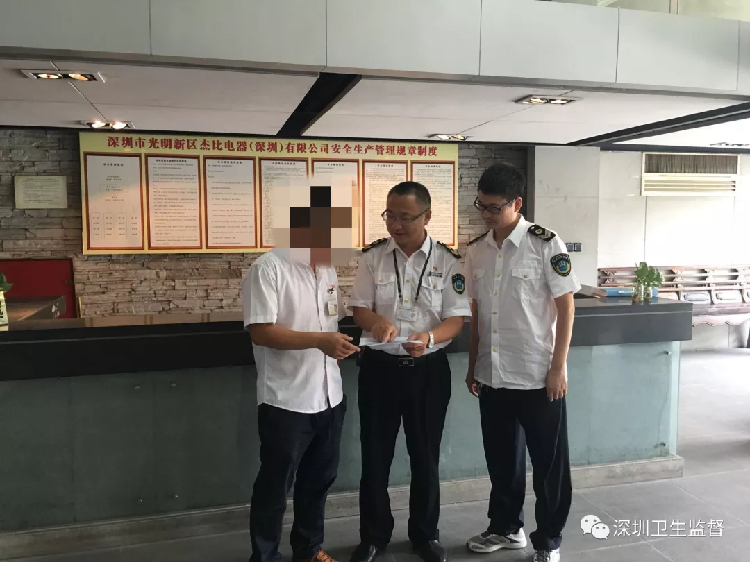 今年6月,光明區(qū)衛(wèi)生監(jiān)督所衛(wèi)生監(jiān)督員對位于轄區(qū)內(nèi)的杰比電器(深圳)有限公司進行日常監(jiān)督檢查。