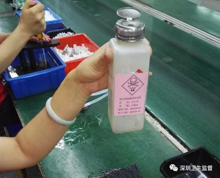 檢查過程中發(fā)現(xiàn)該公司A棟2樓水箱車間,可見組裝線組裝崗位工人韋某正在使用白電油(成分顯示為正己烷)作業(yè),未見佩戴防護指套。