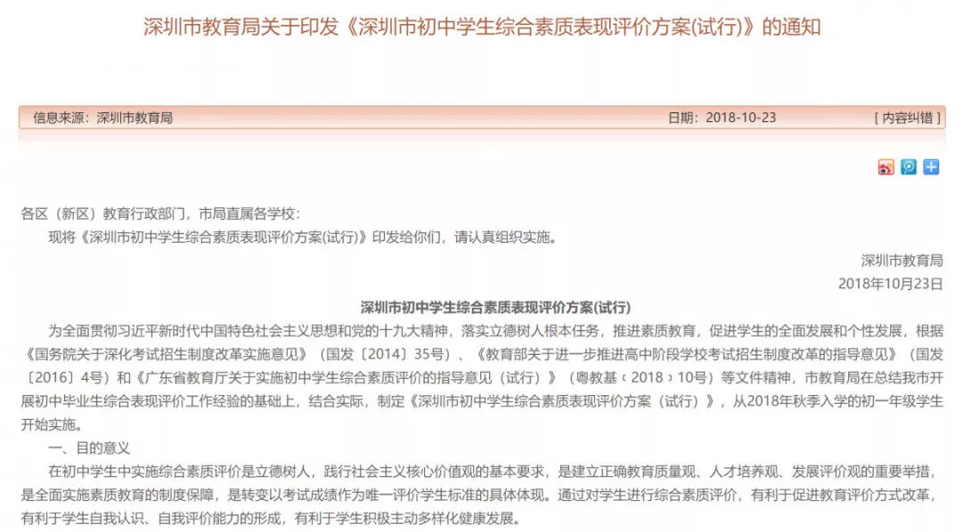 ▲深圳市教育局此前發(fā)布的《深圳市初中學(xué)生綜合素質(zhì)表現(xiàn)評價方案(試行)》