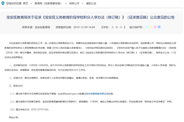 記者剛剛從寶安區(qū)教育局獲悉,12月9日,寶安區(qū)教育局發(fā)布關(guān)于征求《寶安區(qū)義務(wù)教育階段學(xué)校積分入學(xué)辦法(修訂稿)》(征求意見(jiàn)稿)的公告,就寶安區(qū)義務(wù)教育階段學(xué)校積分入學(xué)辦法修訂進(jìn)行征求意見(jiàn)。