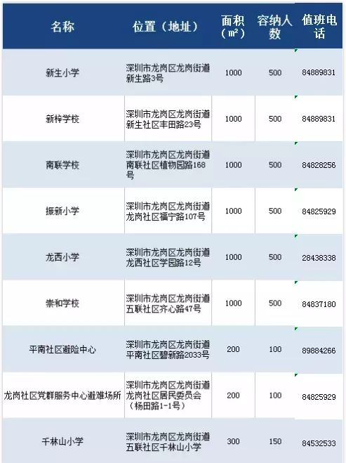 有備無患,也請收好這份龍崗街道各應(yīng)急避難場所信息表。