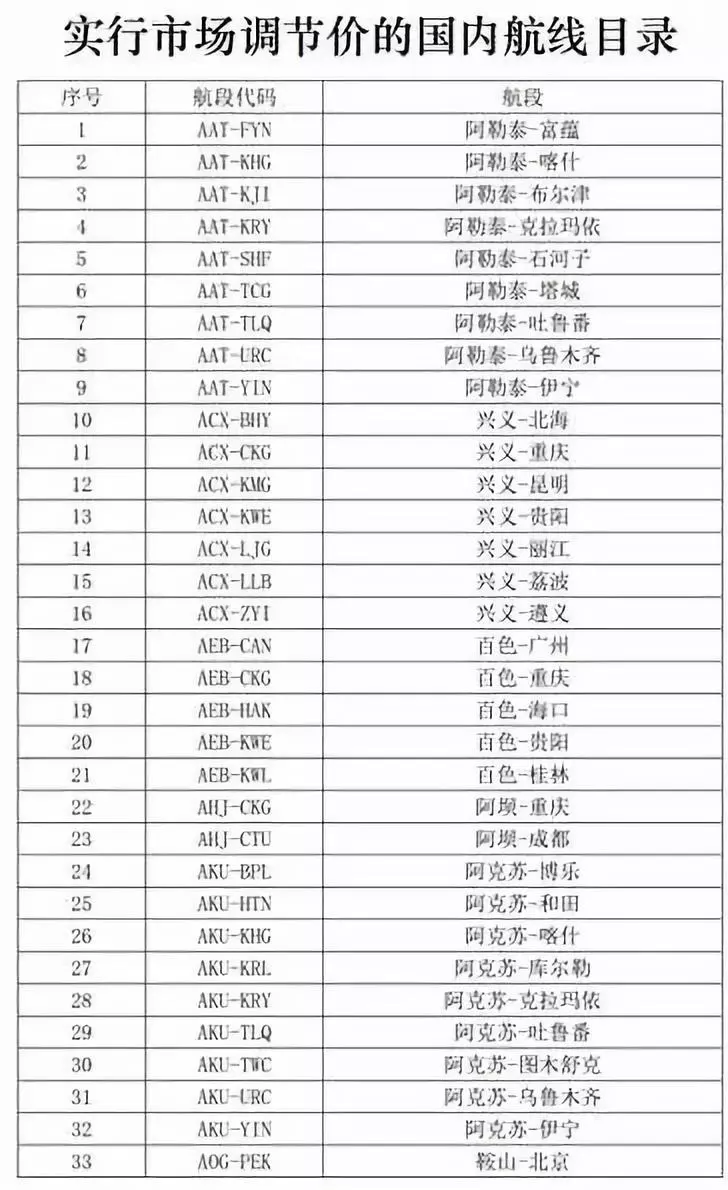 民航局最新《實行市場調(diào)節(jié)價的國內(nèi)航線目錄》部分截圖