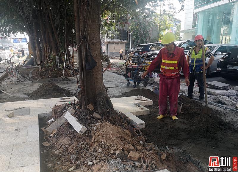 上午10點,深圳市交通運輸局執(zhí)法人員來到福田區(qū)民田路與福華路路口的一處施工現(xiàn)場。記者在現(xiàn)場看到,沿著福華路一側(cè)的人行道基本全部被挖開,建筑工人正在進(jìn)行人行道石磚的鋪設(shè)工作,由于施工圍擋布置不規(guī)范,現(xiàn)場也沒有完善的路線指引,不少市民出行受阻。