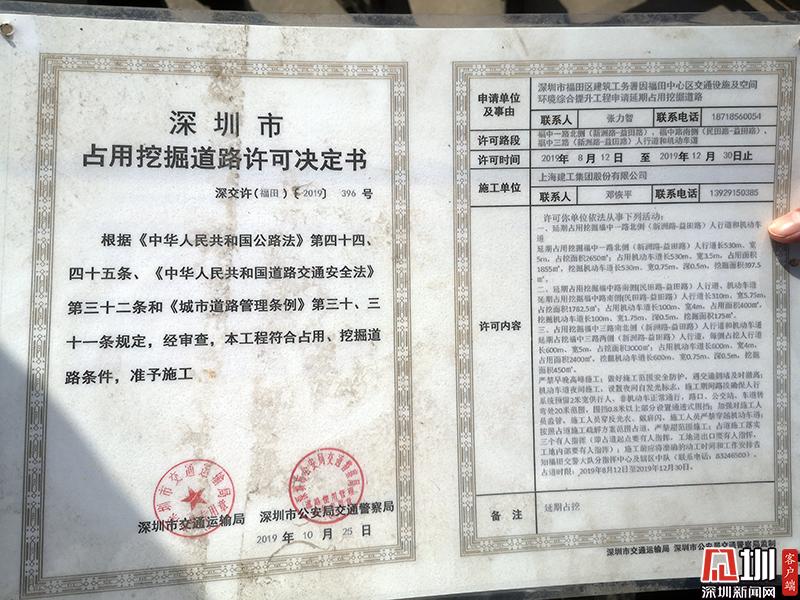 記者在現(xiàn)場(chǎng)了解到,目前該路段正在進(jìn)行福田中心區(qū)道路品質(zhì)改善提升工程的施工,施工單位為中建七局。從現(xiàn)場(chǎng)的占道施工許可證上,記者看到該項(xiàng)目自2019年8月份開始占道施工,預(yù)計(jì)2019年12月31日完工。