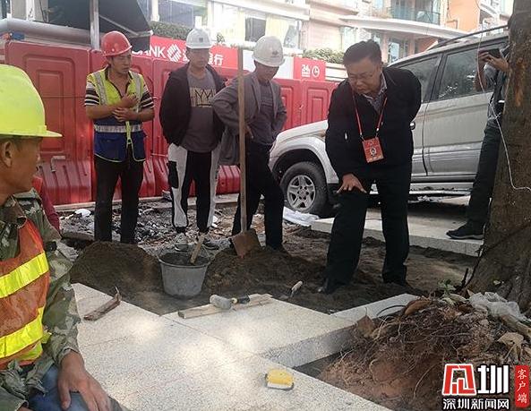 深圳市人大代表胡桂梁(右一)在施工現(xiàn)場(chǎng)進(jìn)行調(diào)研。
