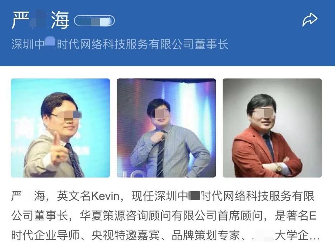 據(jù)介紹,董事長(zhǎng)“嚴(yán)某海”對(duì)外宣傳資料顯示:著名E時(shí)代企業(yè)導(dǎo)師、品牌策劃專(zhuān)家、某知名大學(xué)企業(yè)轉(zhuǎn)型升級(jí)總裁班實(shí)踐導(dǎo)師,擔(dān)任過(guò)多家知名企業(yè)的顧問(wèn)。據(jù)被抓獲的團(tuán)伙成員交代,嚴(yán)某海自稱(chēng)擁有雙碩士學(xué)歷,是香港大學(xué)學(xué)者,還是牛津大學(xué)博士。