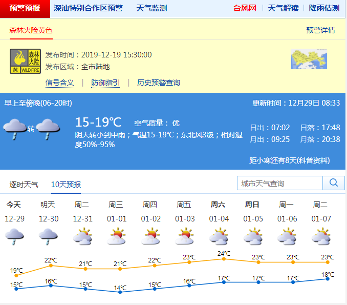 見(jiàn)圳客戶端·深圳新聞網(wǎng)2019年12月29日訊 大雨和冷空氣在年底前在深圳最后一次沖業(yè)績(jī)來(lái)了!據(jù)深圳市氣象臺(tái)29日凌晨4:57發(fā)布的最新預(yù)報(bào),今天周日有中到大雨,伴有零散雷暴,氣溫也將是近幾天的最低,為15-19℃。