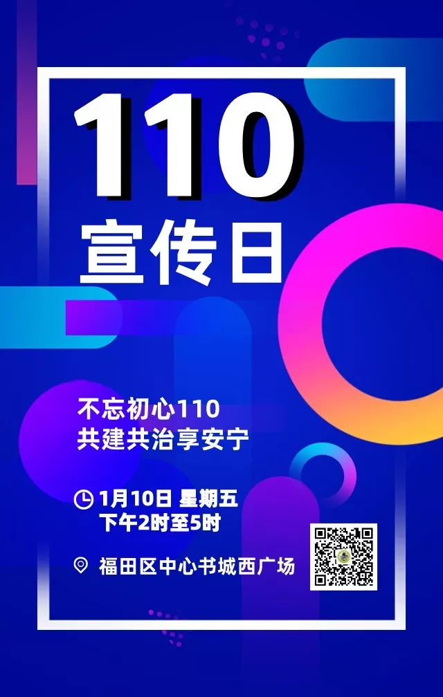 “110宣傳日”來啦!1月10日下午2時(shí)至5時(shí),福田區(qū)中心書城西廣場將作為“110宣傳日”主會(huì)場,本次活動(dòng)主題是“不忘初心110,共建共治享安寧”。