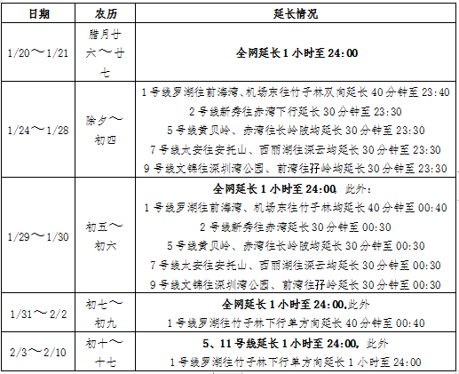 2020年春運(yùn)期間深圳地鐵延長情況表: