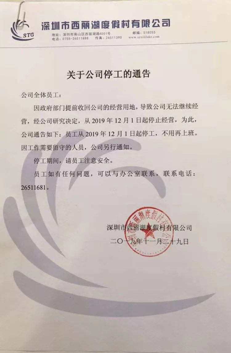 2019年11月29日,西麗湖度假村發(fā)布通告稱,政府提前收回經(jīng)營用地,從2019年12月1日停止?fàn)I業(yè),已經(jīng)不接待外來游客,員工同時停工——這意味著市民所熟知的西麗湖度假村即將走下舞臺。