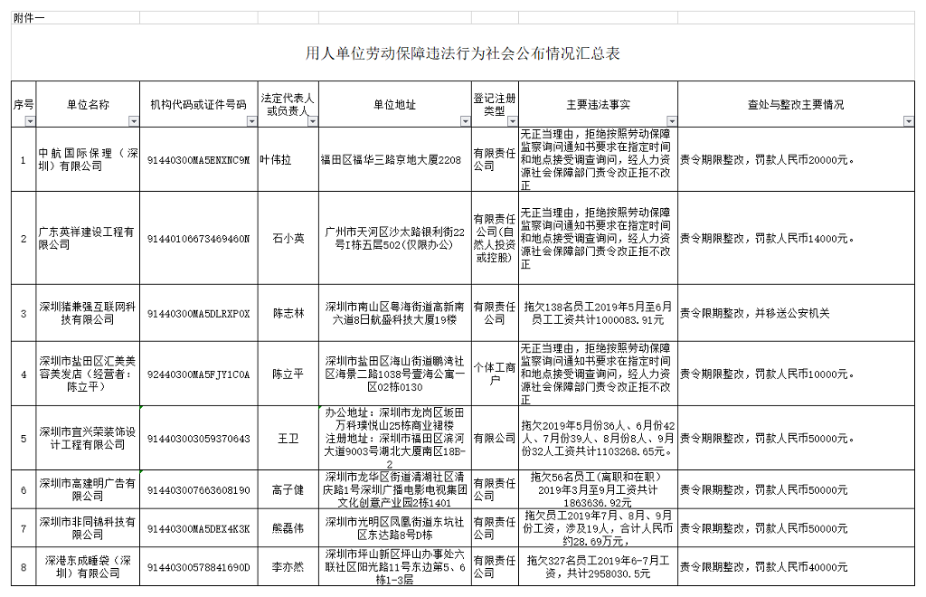 2019年第四季度,深圳市人力資源部門繼續(xù)加大對欠薪等勞動保障違法行為的打擊力度,依法處罰,對涉嫌犯罪的堅決移送司法機關(guān),切實維護勞動者的合法權(quán)益。為加強對違法用人單位的社會監(jiān)督,強化誠信體系建設(shè),加大威懾力,深圳市人力資源和社會保障局依據(jù)《廣東省用人單位重大勞動保障違法行為社會公布暫行規(guī)定》和《深圳市勞動保障違法信息公布辦法》,日前部分區(qū)(新區(qū))人力資源部門查處的一批勞動保障違法案件予以公布。