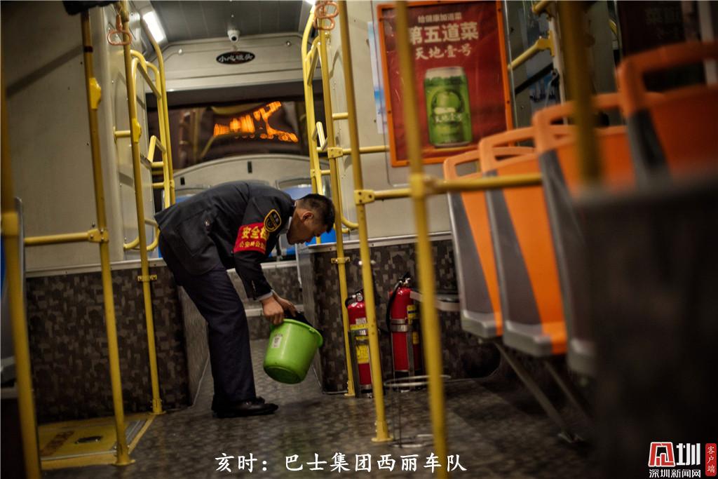 亥時(shí):22點(diǎn)50分左右,深圳巴士集團(tuán)四分公司西麗車隊(duì)駕駛員張華林收班后,在給他的“老搭檔”進(jìn)行衛(wèi)生清潔,第二天,他和他的搭檔又將上路,為市民服務(wù)。