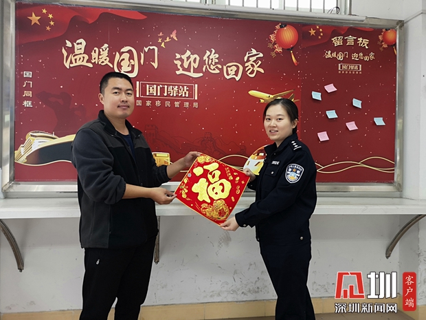 沙頭角邊檢站特別拍攝春節(jié)宣傳片,在口岸多個場地播放,營造“年”的氛圍,為出入境旅客送上小燈籠、“?!弊值刃《Y品,與旅客在執(zhí)勤現(xiàn)場合影,并當(dāng)場打印出照片贈與留念,讓每一位歸家的游子第一時間感受到祖國的溫暖和春節(jié)的幸福。