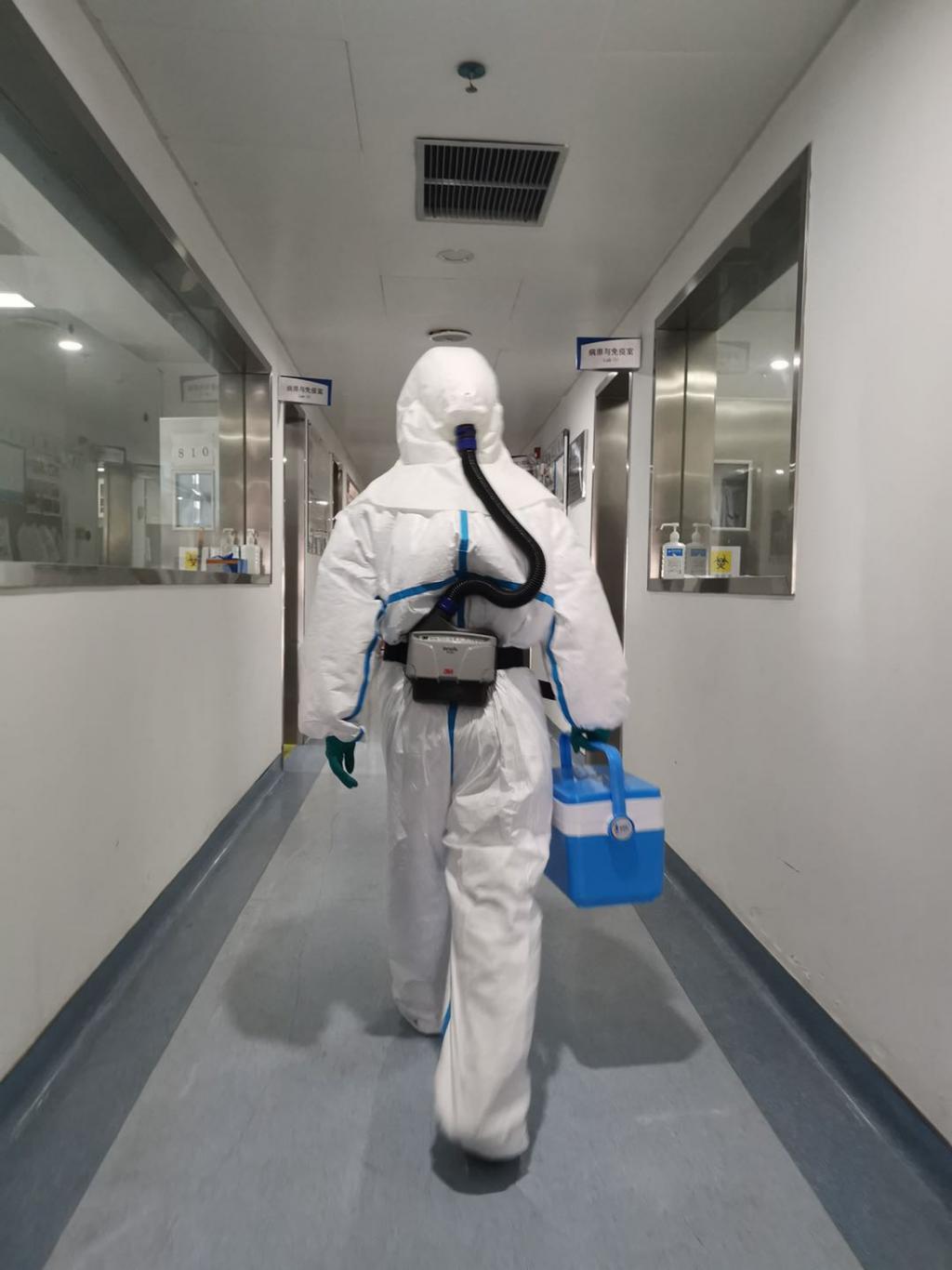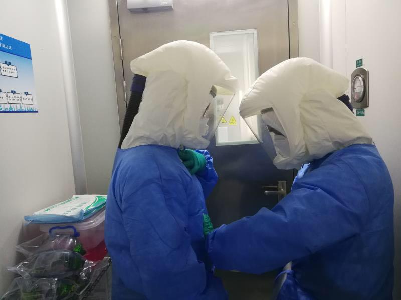 ▲大年三十,深圳市第三人民醫(yī)院實(shí)驗(yàn)室正在進(jìn)行確診患者的病毒載量動態(tài)檢測,他們在操作的時(shí)候穿著重達(dá)3至4斤的個(gè)人防護(hù)裝備,進(jìn)去一次就連續(xù)工作4個(gè)小時(shí)左右,每次出來內(nèi)衣全部濕透。