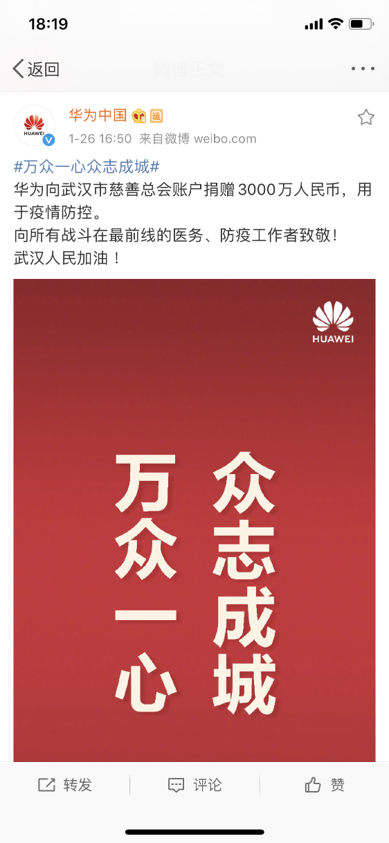 華為表示:“向所有戰(zhàn)斗在最前線的醫(yī)務(wù)、防疫工作者致敬!武漢人民加油!”