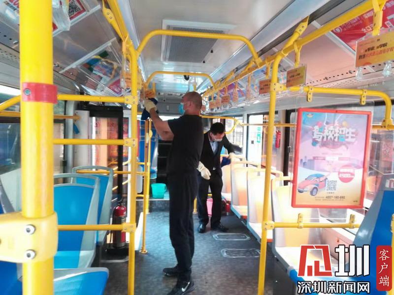 深圳巴士集團屬下公交線路,工作人員正在對公交車廂進行消毒。
