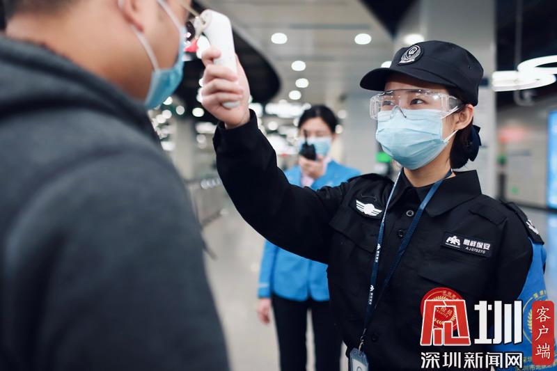 在深圳機場,工作人員對往來乘客進行體溫檢測。