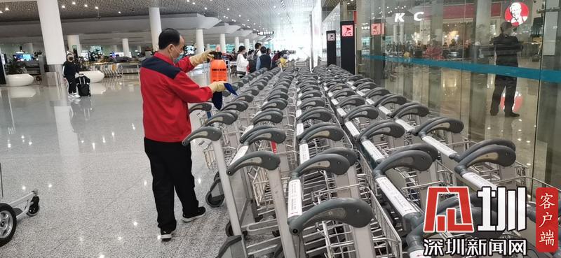 深圳機場工作人員對行李推車進行消毒。