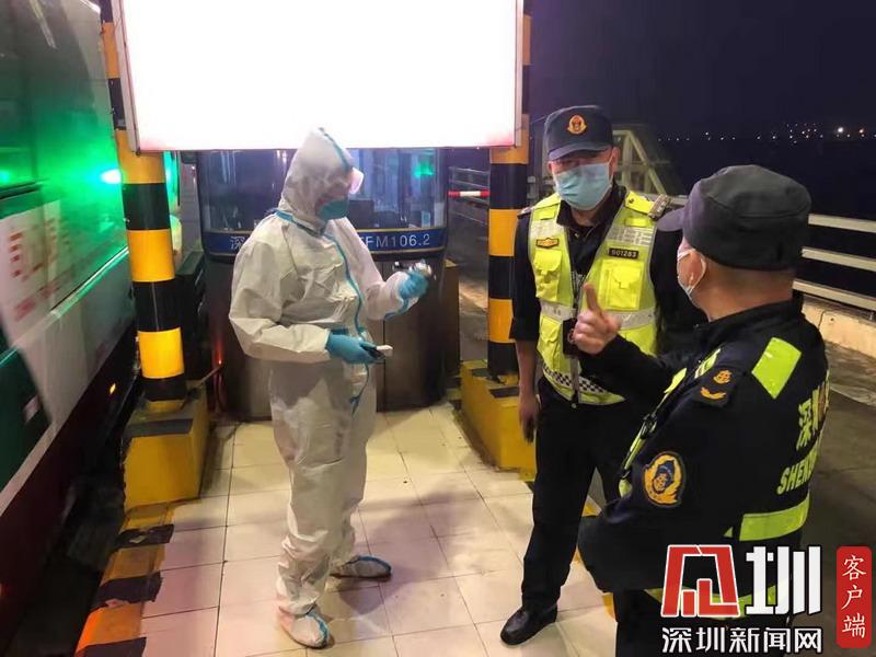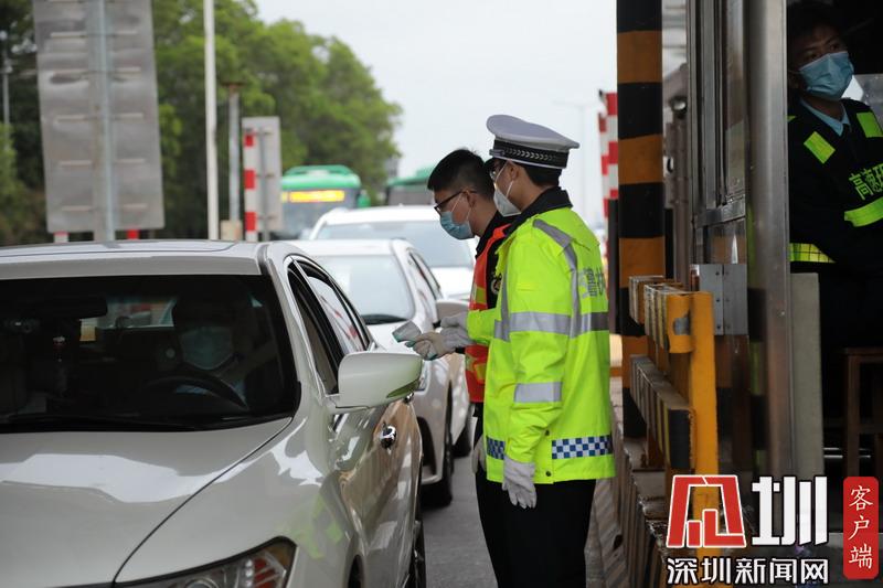 26日下午深圳黃鶴收費站,深圳交警對往來司機進行體溫檢測。