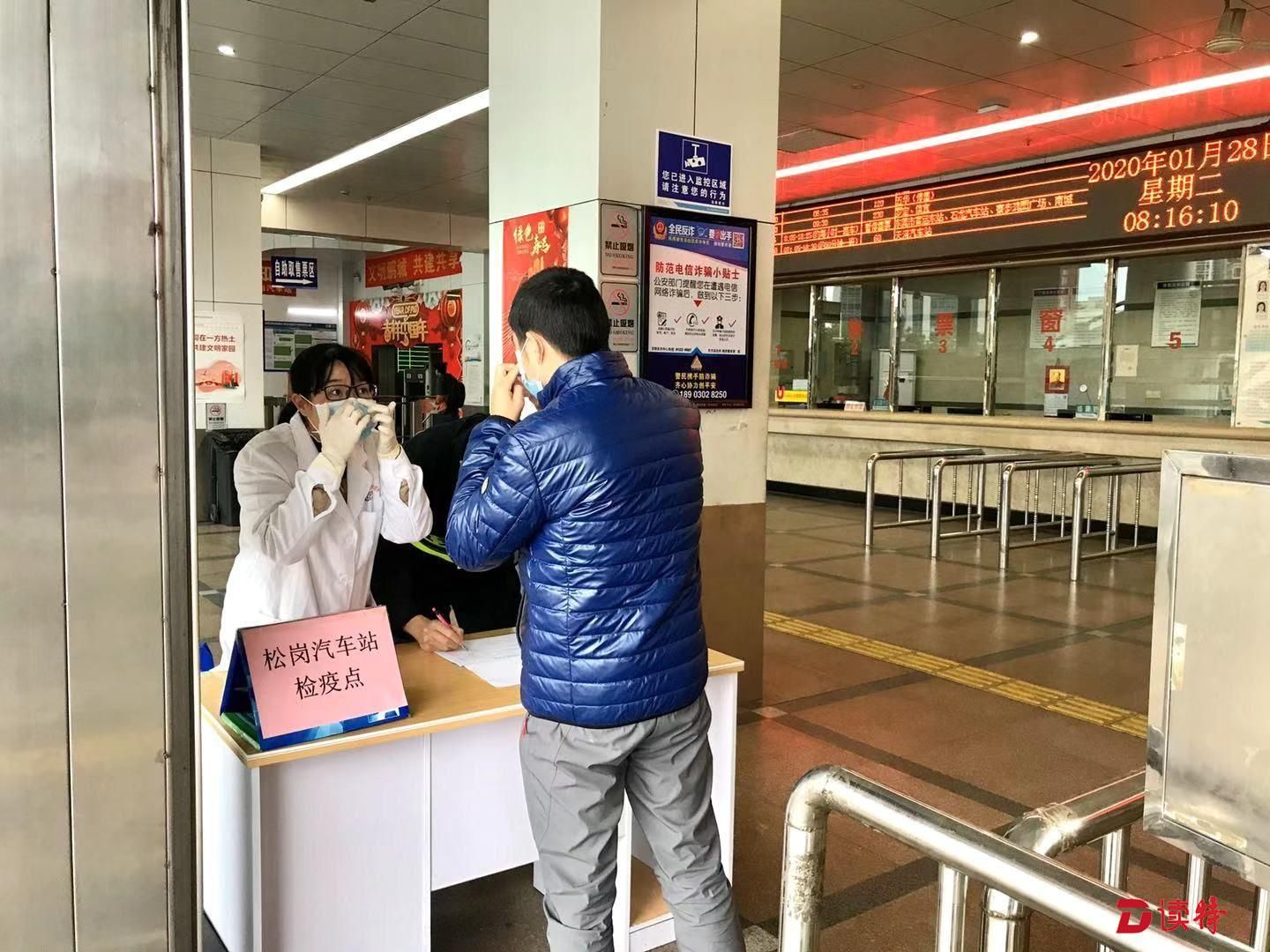 醫(yī)護人員在松崗汽車站檢疫點教市民正確佩戴口罩