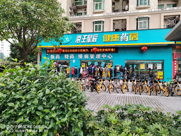 景田海王星辰藥店門(mén)口,深圳市民戴口罩排隊(duì)購(gòu)買(mǎi)口罩等防控物品。(蔣溪林 攝)
