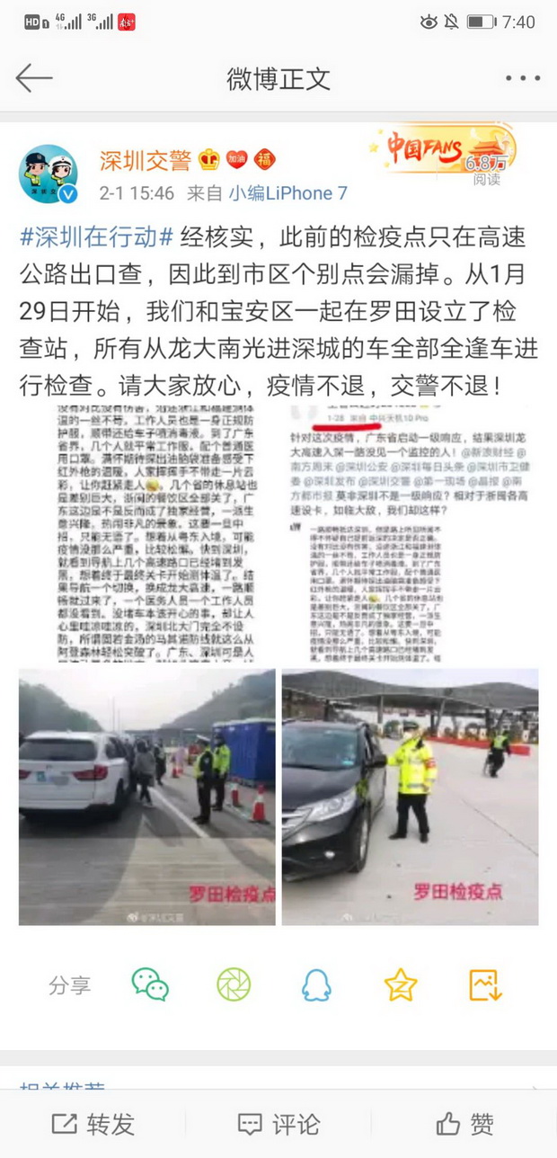 2月1日下午,深圳交警在其官方微博上表示,經(jīng)核實,此前的檢疫點只在高速公路出口查,因此到市區(qū)個別點會漏掉。從1月29日開始,深圳交警和寶安區(qū)一起在羅田設(shè)立了檢查站,所有從龍大南光進深城的車全部全逢車進行檢查。請大家放心,疫情不退,交警不退。