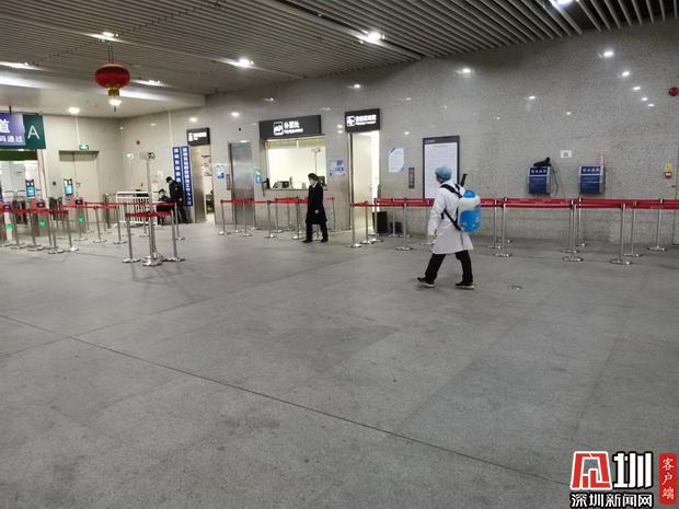 深圳火車站工作人員對候車室、站臺等區(qū)域進行消殺。