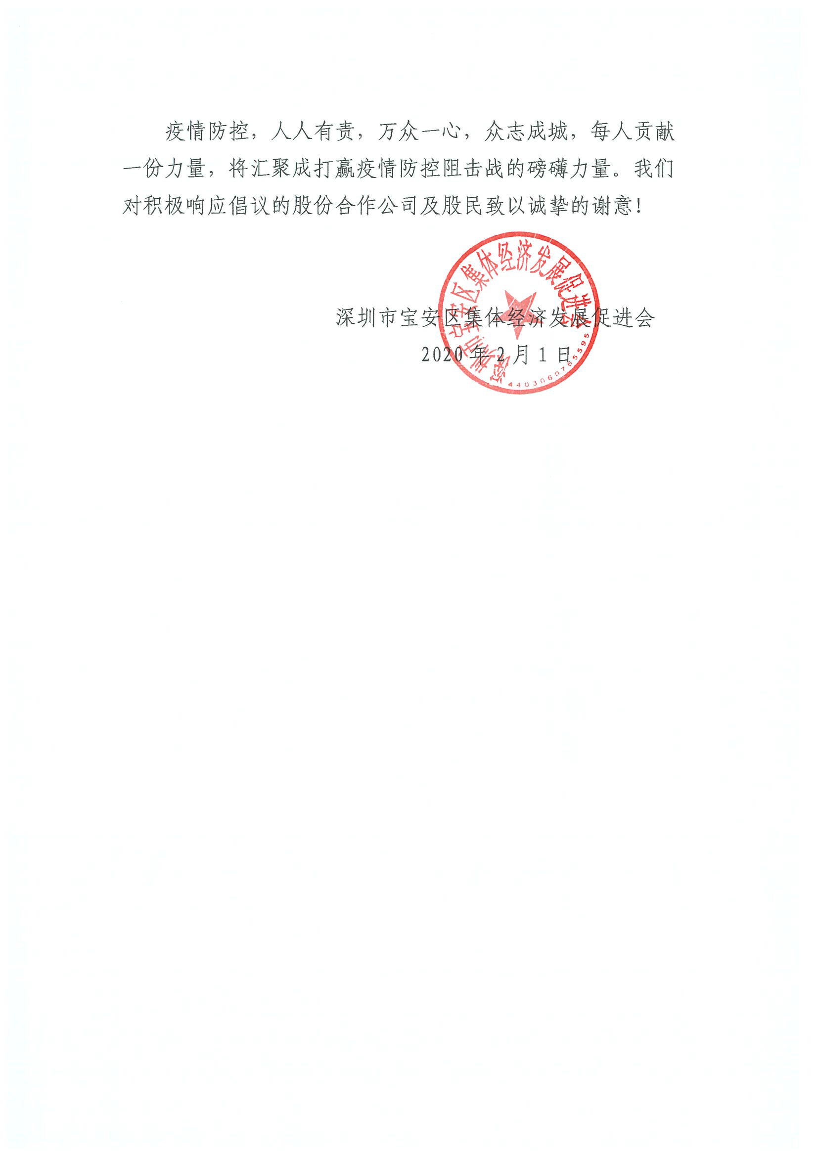 深圳新聞網(wǎng)寶安訊 “疫情防控,人人有責(zé),萬眾一心,眾志成城,每人貢獻(xiàn)一份力量,將匯聚成打贏疫情防控阻擊戰(zhàn)的磅礴力量。”2月1日晚,寶安區(qū)集體資產(chǎn)管理局指導(dǎo)寶安區(qū)集體經(jīng)濟(jì)發(fā)展促進(jìn)會向?qū)毎矃^(qū)各社區(qū)股份合作公司、全體股份合作公司股民發(fā)出《同心協(xié)力共克時艱適當(dāng)減免企業(yè)及來深務(wù)工人員租金的倡議書》,號召全區(qū)股份合作公司及股民適當(dāng)減免企業(yè)及來深務(wù)工人員15-30天租金及物業(yè)費(fèi),并根據(jù)疫情防控的需要可再次追加減免。