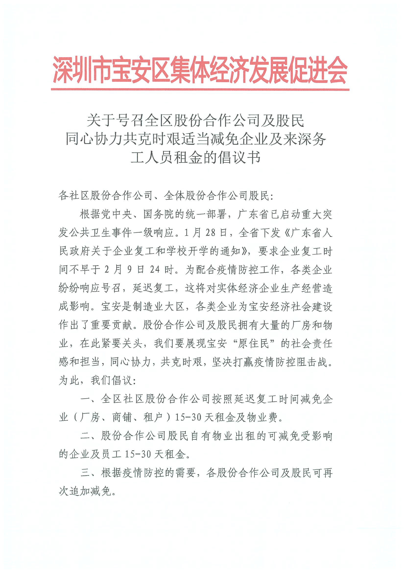 倡議書中寫道,為配合疫情防控工作,各類企業(yè)紛紛響應(yīng)號召,延遲復(fù)工,這將對實(shí)體經(jīng)濟(jì)企業(yè)生產(chǎn)經(jīng)營造成影響。寶安是制造業(yè)大區(qū),各類企業(yè)為寶安經(jīng)濟(jì)社會建設(shè)作出了重要貢獻(xiàn)。股份合作公司及股民擁有大量的廠房和物業(yè),在此緊要關(guān)頭,我們要展現(xiàn)寶安“原住民”的社會責(zé)任感和擔(dān)當(dāng),同心協(xié)力,共克時艱,堅(jiān)決打贏疫情防控阻擊戰(zhàn)。為此,寶安區(qū)集體資產(chǎn)管理局指導(dǎo)寶安區(qū)集體經(jīng)濟(jì)發(fā)展促進(jìn)會發(fā)起倡議,號召全區(qū)股份合作公司及股民按照延遲復(fù)工時間減免企業(yè)(廠房、商鋪、租戶)15-30天租金及物業(yè)費(fèi);股份合作公司股民自有物業(yè)出租的可減免受影響的企業(yè)及員工15-30天租金;同時,根據(jù)疫情防控的需要,各股份合作公司及股民可再次追加減免。