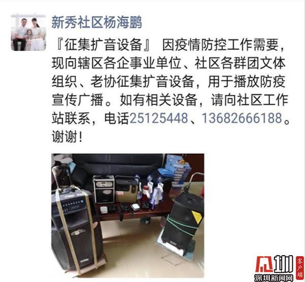 疫情面前,小廣播能發(fā)揮大作用,方便大力宣傳防疫知識(shí)。疫情在不斷蔓延,廣播宣傳任務(wù)任務(wù)緊急,而其中新秀社區(qū)一時(shí)沒有足夠的擴(kuò)音設(shè)備,于是,立即向居民、社會(huì)團(tuán)體、企業(yè)等發(fā)出征集令。新秀社區(qū)黨委書記楊海鵬在微信朋友圈發(fā)布了征集信息及聯(lián)系電話。沒想到這征集令一發(fā)出,很快就得到了市民朋友的積極響應(yīng)。