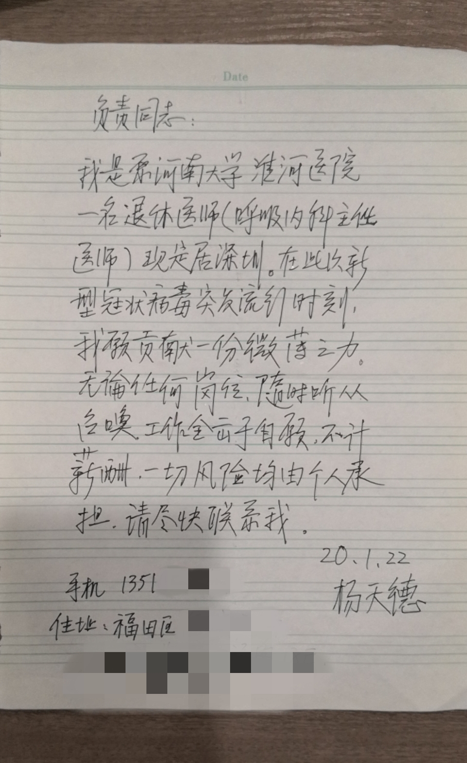 深圳新聞網(wǎng)2月4日訊(見(jiàn)圳客戶(hù)端、深圳新聞網(wǎng)記者 邱曉潔)1月23日,福田街道海濱社區(qū)工作站收到一封請(qǐng)?jiān)笗?shū),上面寫(xiě)著:“我愿貢獻(xiàn)一份微薄之力,無(wú)論任何崗位,隨時(shí)聽(tīng)從召喚,工作全出于自愿,不計(jì)薪酬,一切風(fēng)險(xiǎn)均由個(gè)人承擔(dān)?!痹谡?qǐng)?jiān)笗?shū)的最后,還附上了自己和愛(ài)人的聯(lián)系電話(huà)及住址。