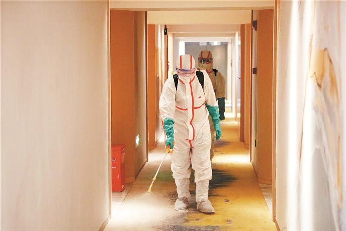 秦彥珉告訴記者,像這樣一座6層樓高的中型酒店,進行一次完整消殺大約需要兩個多小時。4名工作人員中兩人負責使用 L30車載式噴霧器,對較大空間進行整體消殺;另外兩人則分別背著兩臺背負式消毒噴霧器,對較小空間的空氣以及門把手、垃圾桶、衛(wèi)生間設施等物品表面進行消毒。