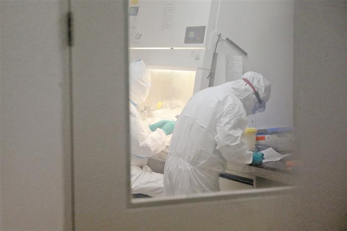 每次走進(jìn)實(shí)驗(yàn)室之前,武偉華都要穿好厚厚的防護(hù)服,從頭到腳全副武裝。打開那扇通往實(shí)驗(yàn)室的厚重大門,燈光在白色的墻壁上反射出冷冷的光,一直照到長長的走廊盡頭。走入實(shí)驗(yàn)室前,所有的技術(shù)人員還要經(jīng)過一個(gè)緩沖區(qū),這個(gè)區(qū)域每天要經(jīng)過數(shù)次化學(xué)消毒和紫外線消毒,保證致命病毒無法彌散。每結(jié)束一組檢測(cè),檢測(cè)人員還要再經(jīng)歷一次全面消毒,如此往復(fù)。