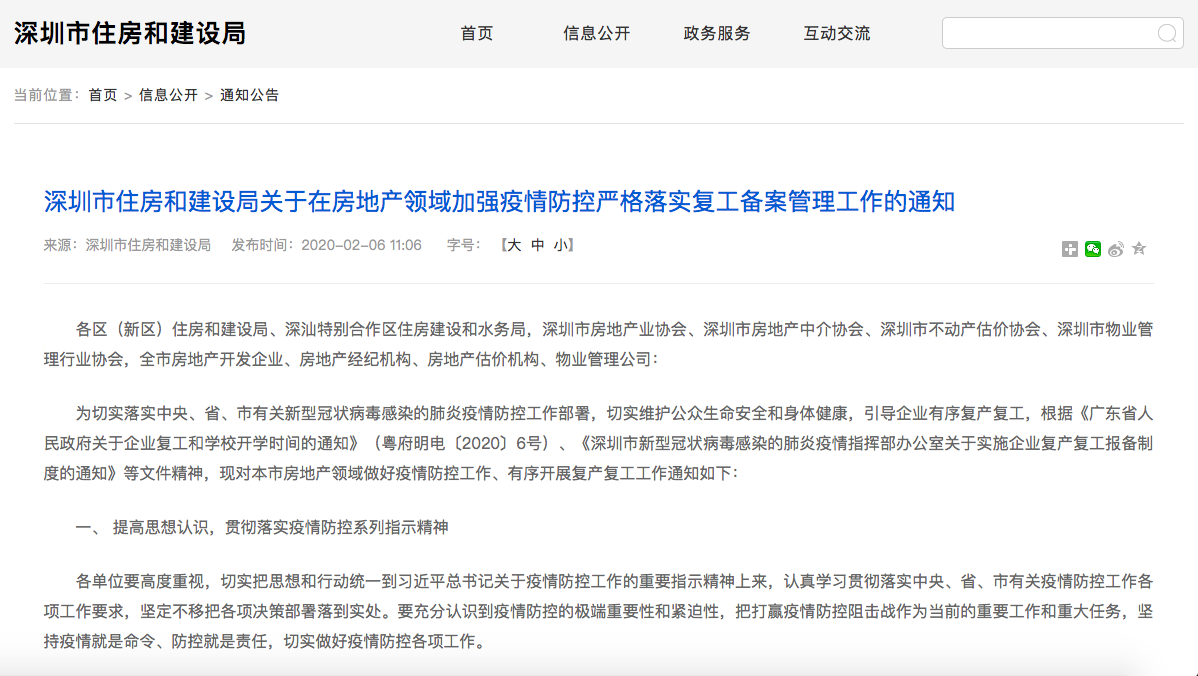 根據(jù)該通知,為按照省、市關(guān)于企業(yè)復(fù)產(chǎn)復(fù)工有關(guān)工作安排,深圳各房地產(chǎn)開(kāi)發(fā)企業(yè)、房地產(chǎn)經(jīng)紀(jì)機(jī)構(gòu)、房地產(chǎn)估價(jià)機(jī)構(gòu)(以下稱(chēng)房地產(chǎn)企業(yè))應(yīng)嚴(yán)格執(zhí)行不早于2020年2月9日24時(shí)前復(fù)工營(yíng)業(yè)的要求。2月10日后,各房地產(chǎn)企業(yè)應(yīng)根據(jù)深圳市及所在轄區(qū)疫情防控要求,結(jié)合企業(yè)自身情況,按程序備案后方可復(fù)工營(yíng)業(yè)。在此期間,各企業(yè)應(yīng)依法保障員工的合法權(quán)益。