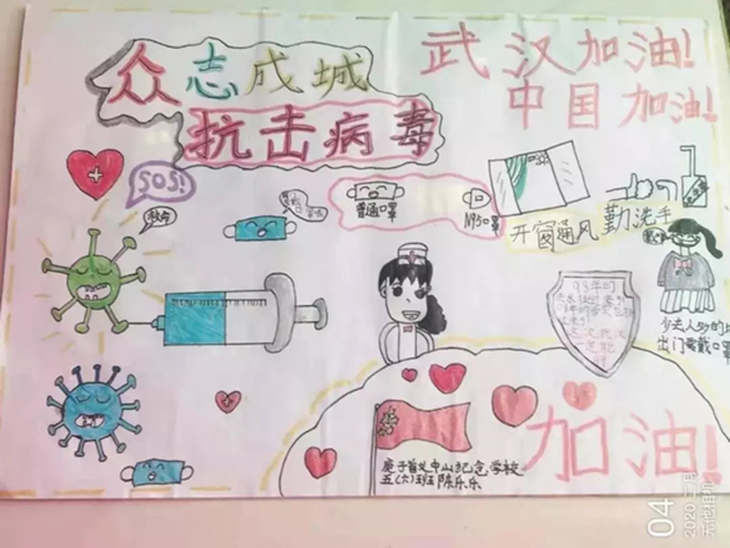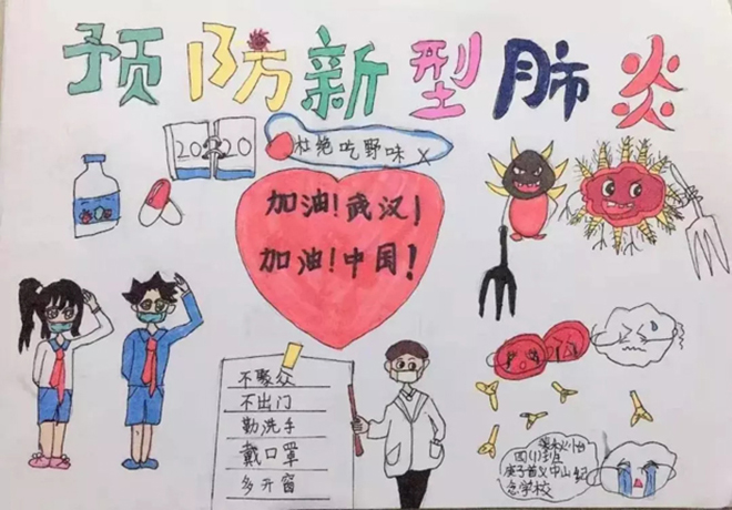 一(1)中隊(duì)的張明堯、四(6)中隊(duì)的劉晨希等同學(xué)用繪制手抄報(bào)的形式詮釋“預(yù)防新型冠狀病毒感染的肺炎,從我做起”。