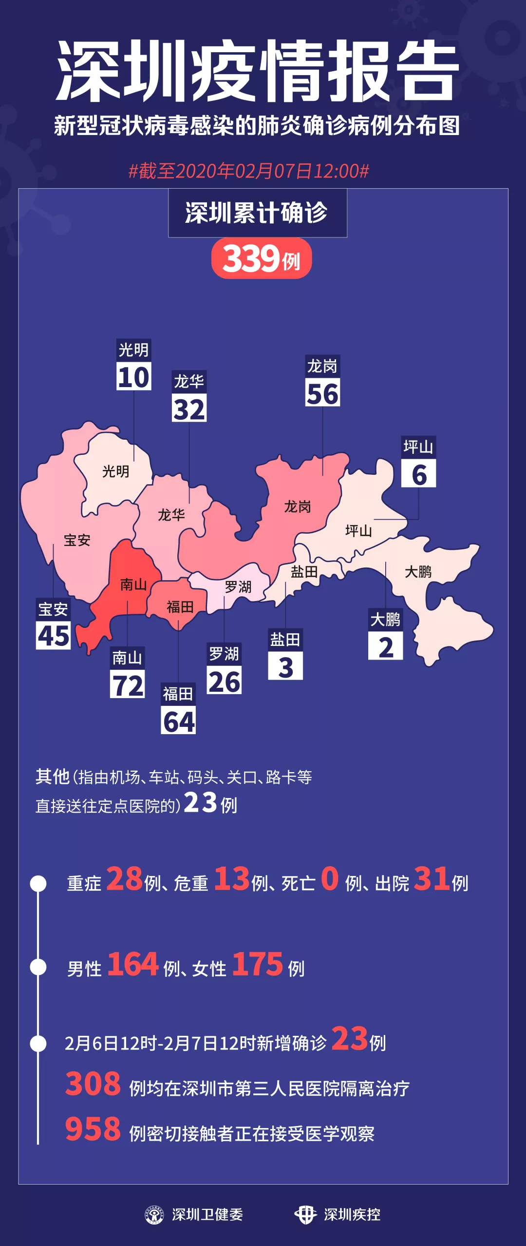 2月6日12時-2月7日12時,深圳新增新型冠狀病毒感染的肺炎確診病例23例。