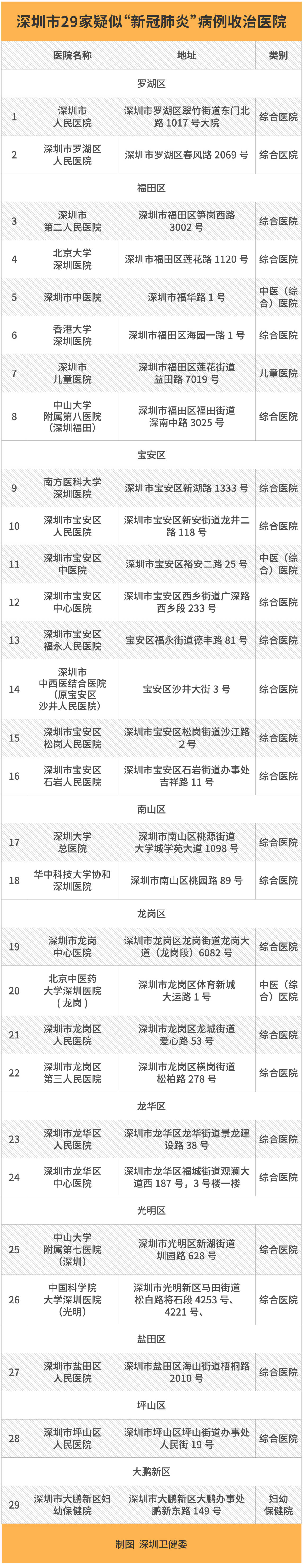 如果患者符合疑似病例條件,應(yīng)就地隔離。與此同時,醫(yī)院會立即將患者情況上報,并同步報告至所在區(qū)域收治醫(yī)院。目前,深圳已經(jīng)發(fā)布了29家疑似病例收治醫(yī)療機構(gòu)名單,市級收治醫(yī)院主要負責本院就診的疑似病例的集中收治,區(qū)級收治醫(yī)院主要負責本院就診及接收轄區(qū)區(qū)屬醫(yī)院、社會辦醫(yī)院和社區(qū)健康服務(wù)中心等基層醫(yī)療機構(gòu)轉(zhuǎn)診的疑似病例的集中排查和收治。