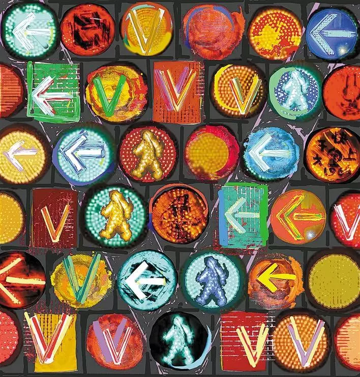 梁宇透露,這件作品的創(chuàng)作四易其稿,將信號(hào)燈所指代的“社會(huì)規(guī)則”加以排列強(qiáng)化,以此強(qiáng)調(diào)“秩序”本身在與疾病博弈混亂環(huán)境中的重要性。作品以濃烈的對(duì)比色彩、緊密排列的幾何圖形試圖傳達(dá)當(dāng)下人們的緊張情緒和焦慮心態(tài)。同時(shí),信號(hào)燈中“行走”、“前進(jìn)”、“Victory”的提示標(biāo)識(shí),被清晰地提煉出來(lái),成為能讓畫(huà)面安定的因素,望帶給觀者一點(diǎn)思緒的寧?kù)o與心靈的慰藉。