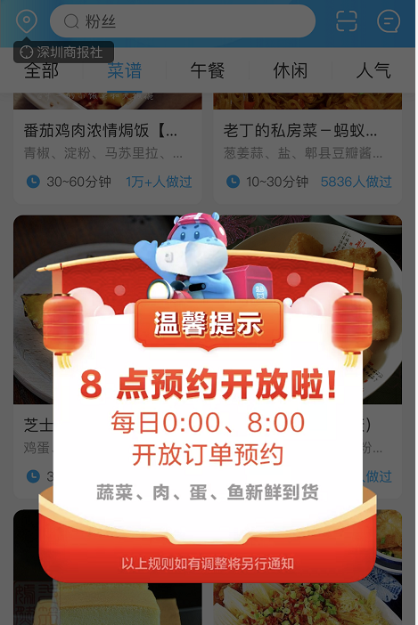 下單時間:每日0點、8點開放訂單預(yù)約。運力緊張,需提前搶購,此外,盒馬部分區(qū)域門店暫只可預(yù)約當(dāng)日配送服務(wù),若當(dāng)日配送服務(wù)已約滿,會顯示“配送小哥已約滿,歡迎門店選購”。