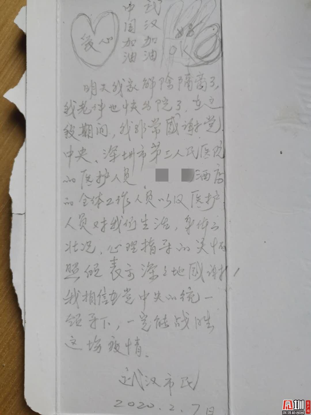 2月7日,一位來深的武漢市民在離開桃源定點隔離酒店前,匆忙中不忘撕下一片紙巾盒,用酒店的鉛筆留下一張暖心紙條,對陪他度過14天隔離期的工作人員表達由衷的感激,對全民抗“疫”的前景表示必勝的信心。